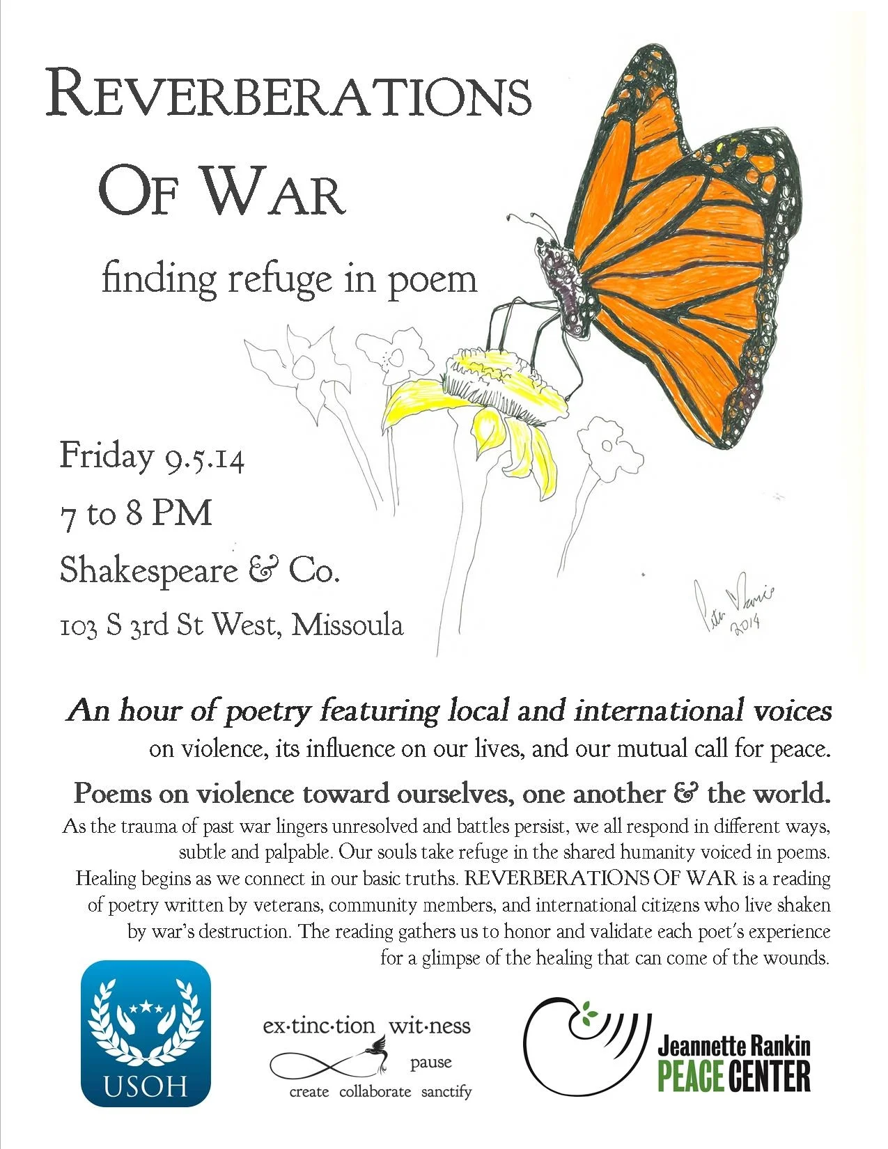 REVERBERATIONS OF WAR is a reading of poetry written by veterans, community members, and international citizens who live shaken by war’s destruction. The reading gathers us to honor and validate each poet's experience for a glimpse of the healing that can come of the wounds.